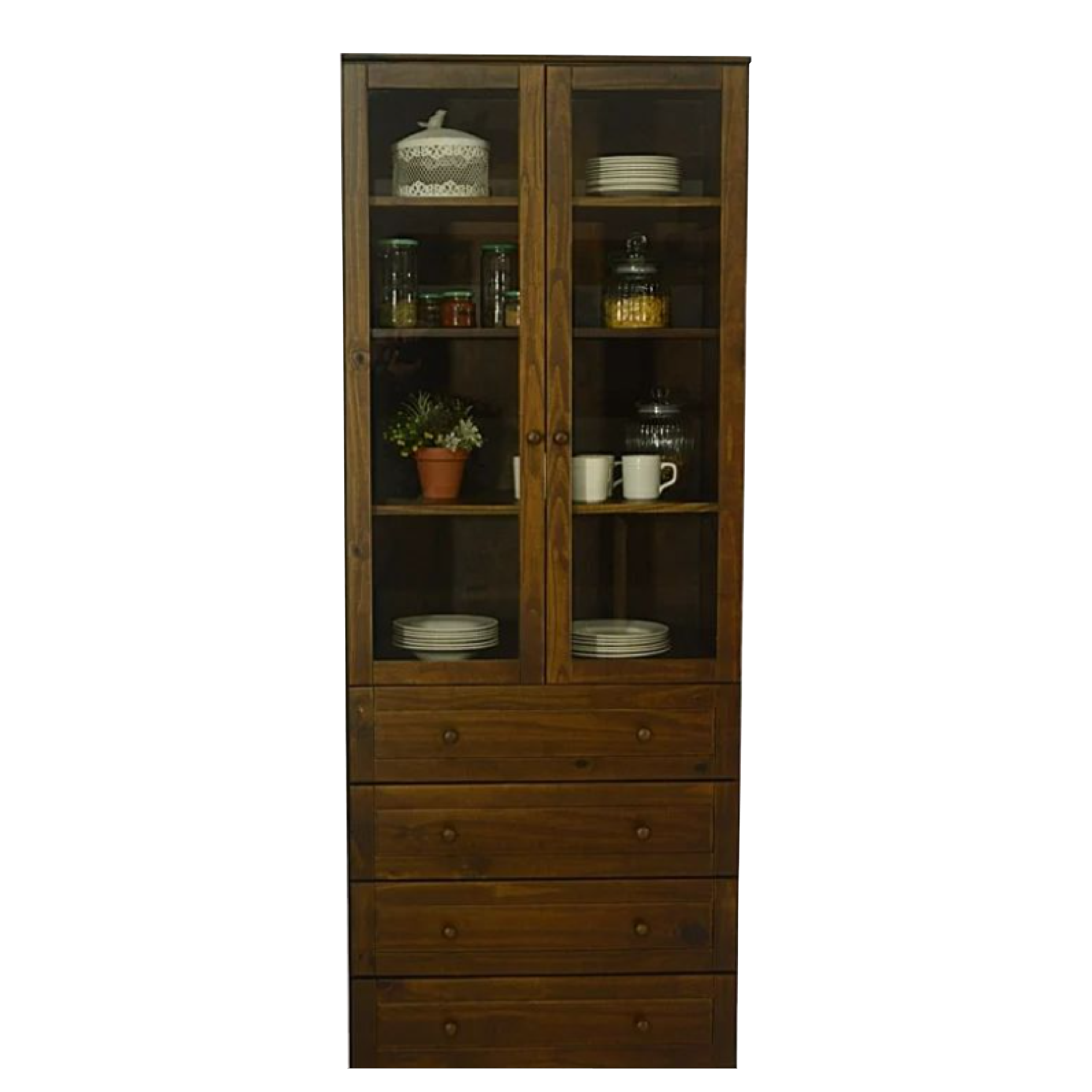 Fabricado en pino misionero / 2 puertas largas de vidrio / 4 cajones / Lustre cedro / Medidas: 0.80 de ancho x 2.12 de alto x 0.49 de profundidad.
