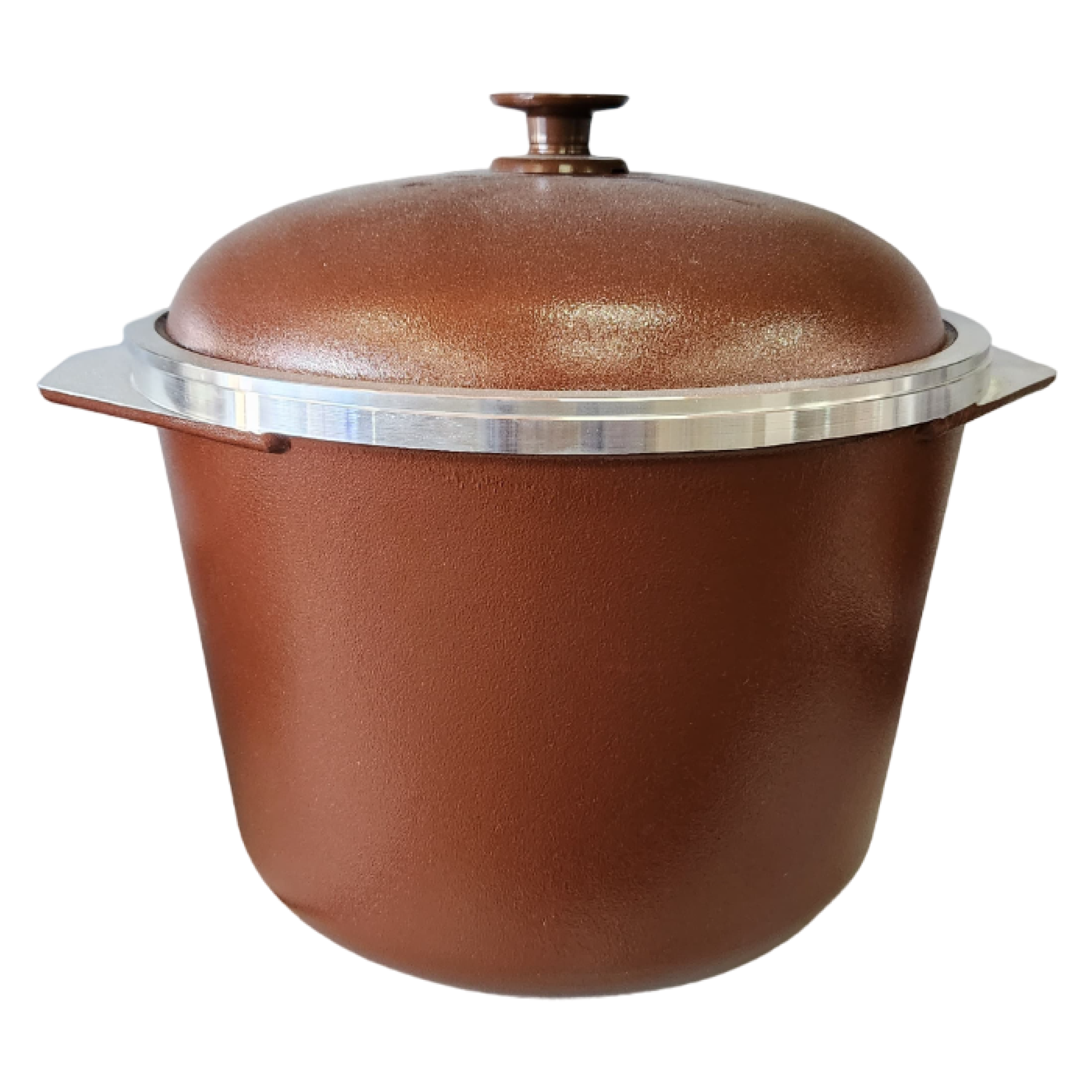 Olla con asas de material de aluminio / Con tapa / Revestida exteriormente por esmalte Epoxi poliester / Facil limpieza, inalterable al fuego / Capacidad: 14Lts. / Medida: 33cm de diametro superior y 23cm de diametro inferior x 33 cm. de alto.