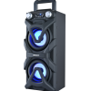 A batería / Potencia 80W RMS / 2 woofer de 8 pulgadas + 1 tweeter de 2 pulgadas / Conexión Bluetooth / Entrada auxiliar 3.5mm y para micrófono / Función Stromberg Connect / Luces LED / Ecualizador con controles de bajos y agudos / Función karaoke / Incluye micrófono.