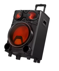 A batería / Potencia 100W RMS / Woofer 12 pulgadas / Conexión Bluetooth / Entrada AUX y SD / Sintonizador FM / Entradas de micrófono y guitarra / Luces rítmicas / Control de graves y agudos / Ecualizador / Karaoke / Transportable / Control remoto.