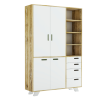 Fabricado en melamina color everest / 3 cajones profundos vistos / 4 cajones interiores / 14 estantes tipo box / 2 barrales / Correderas y bisagras metálicas / 6 puertas de abrir con manijas metálicas color cobre vintage / Medidas: 1.80 de largo x 2.12 de alto x 0.60 de profundidad.