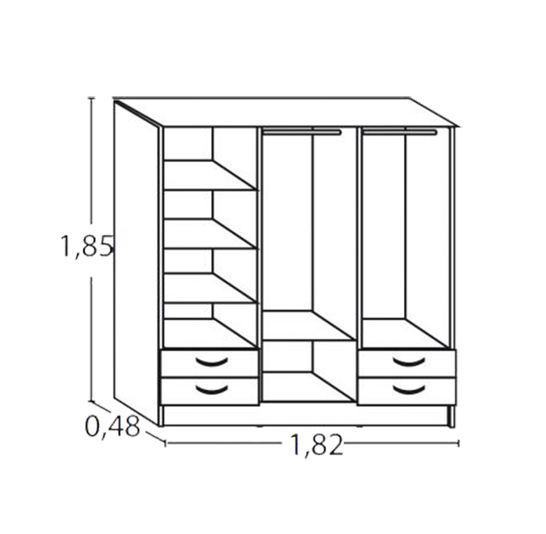 Fabricado en melamina color gris andino / 6 puertas de abrir / 4 cajones con correderas metálicas / 2 barrales / 4 estantes / Medidas: 1.82 de ancho x 0.48 de profundidad x 1.85 de alto.