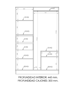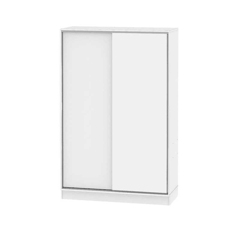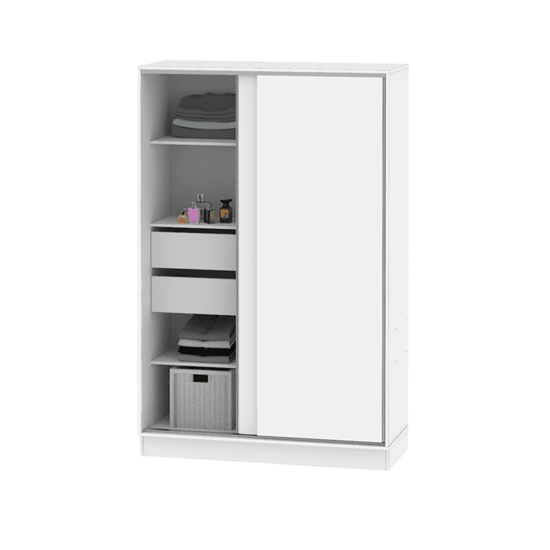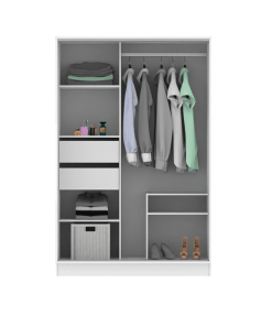 Fabricado en melamina color blanco / 2 puertas corredizas, 4 estantes, 1 barral, 2 cajones internos, espacio para calzado / Medidas: 1.27 de largo x 1.95 de alto x 0.51 de profundidad.