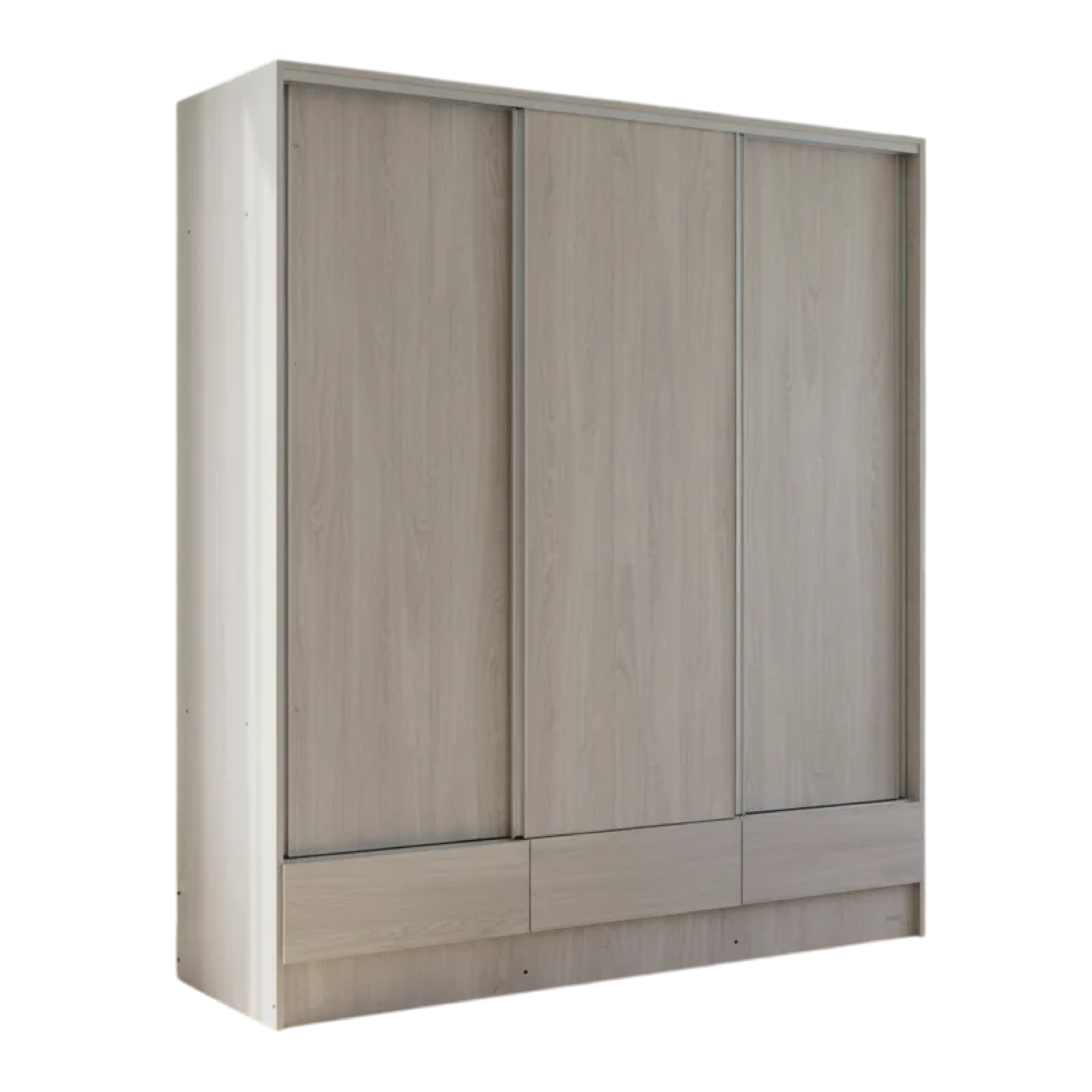 Fabricado en melamina color gris andino / 3 puertas corredizas con perfiles de aluminio / 3 cajones con correderas metálicas / 2 barrales / 7 estantes / Rieles de aluminio / Medidas: 1.81 de ancho x 0.61 de profundidad x 2.22 de alto.