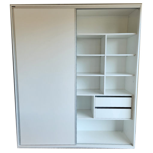 18mm blanco / Puertas corredizas / Estantes tipo box / 2 cajones con correderas telescópicas / Barral cromado / Ensamblado con sujeciones Minifix y Rafix / Medidas: 2.10 de alto x 1.80 de ancho x 0.60 de profundidad.