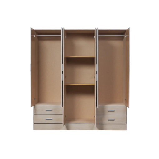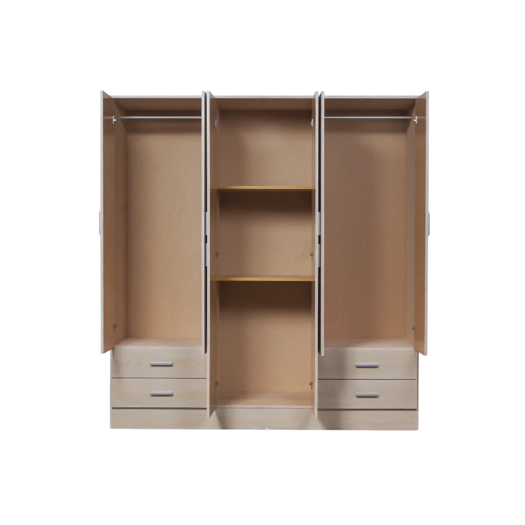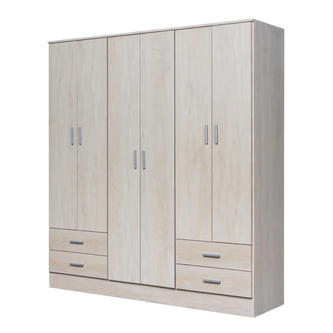 Fabricado en MDP 15mm imprimado color fresno blanco / 6 puertas de abrir / 4 cajones con correderas plásticas / Interior crudo / Medidas: 1.70 de ancho x 0.47 de profundidad x 1.82 de alto.