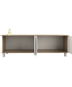Fabricado en melamina color olmo finlandes combinado con everest / 4 puertas / Para TV de hasta 75 pulgadas / Sistema push en puertas / Sistema Minifix / Bisagras metálicas / Patas plásticas con terminación en laca UV / Medidas: 1.80 de largo x 0.52 de alto x 0.36 de profundidad.