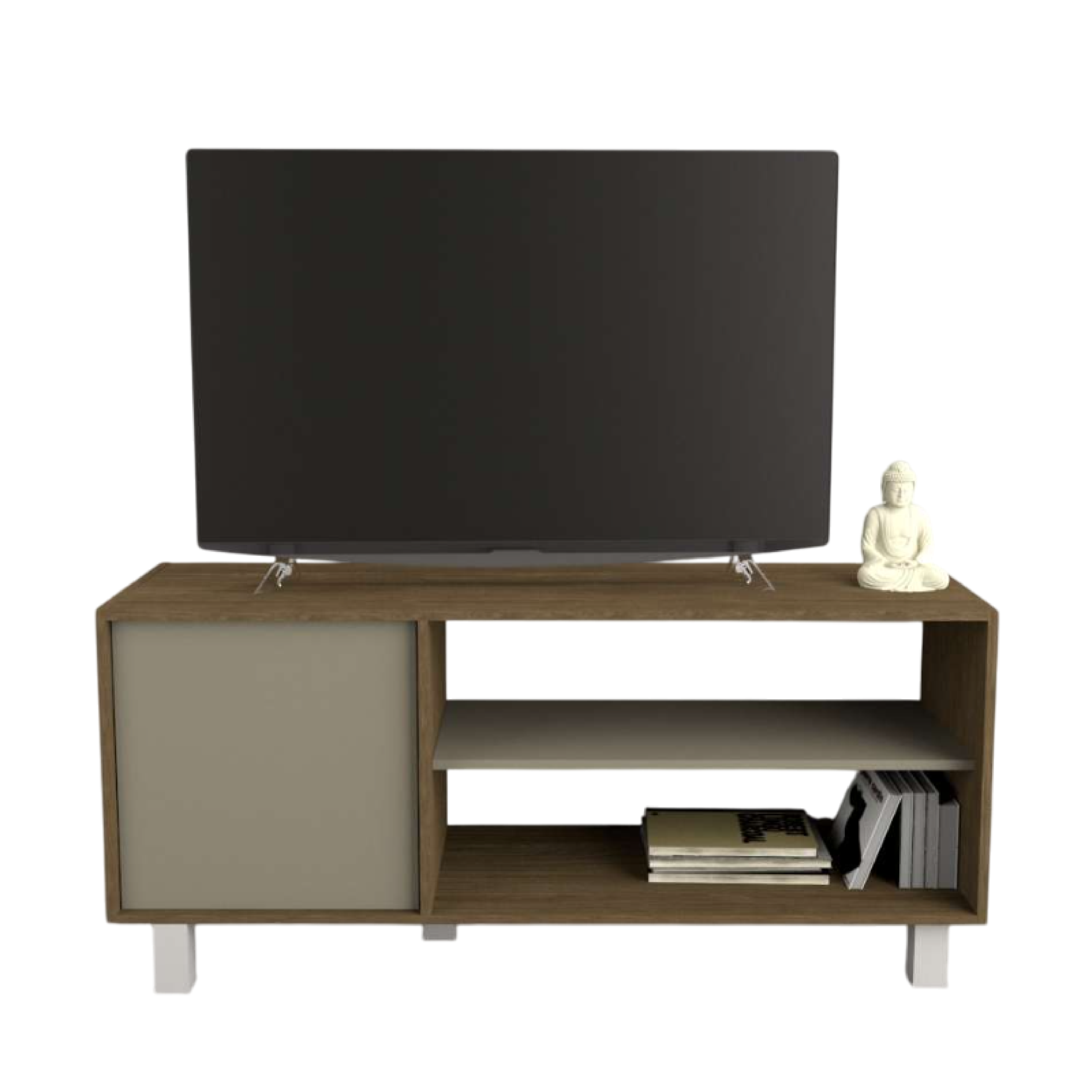 Fabricado en melamina color nogal combinado con gris cubanita / 1 estante visto / 1 puerta / Para TV de hasta 55 pulgadas / Sistema push en puerta / Sistema Minifix / Bisagras metálicas / Patas plásticas con terminación en laca UV / Medidas: 1.28 de largo x 0.52 de alto x 0.36 de profundidad.