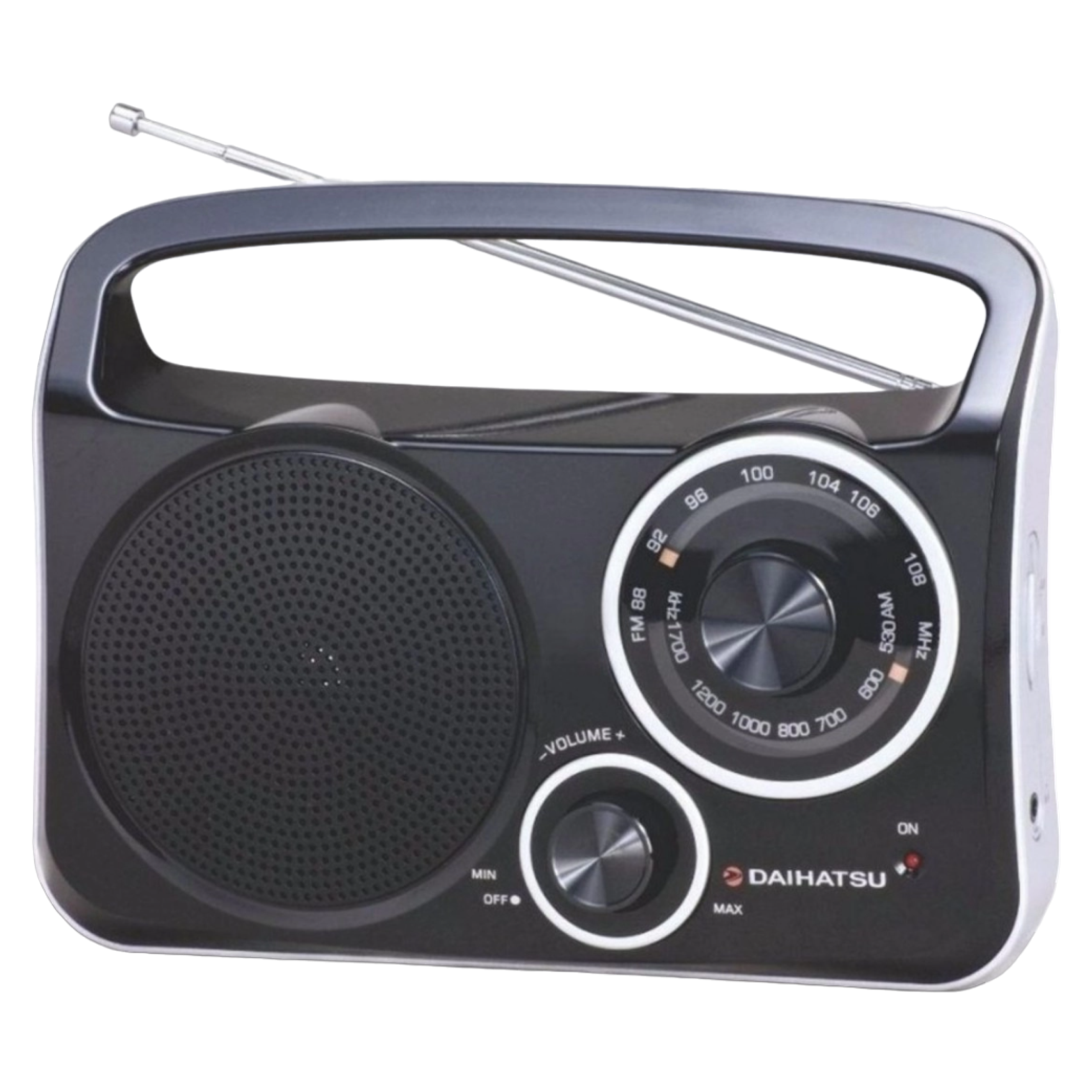 Radio con sintonizador AM y FM / Analógica / Alimentación DUAL eléctrica a 220V o con 4 pilas AA / Conexión para auriculares / Parlante incorporado con alta calidad de sonido y sintonización / Manija