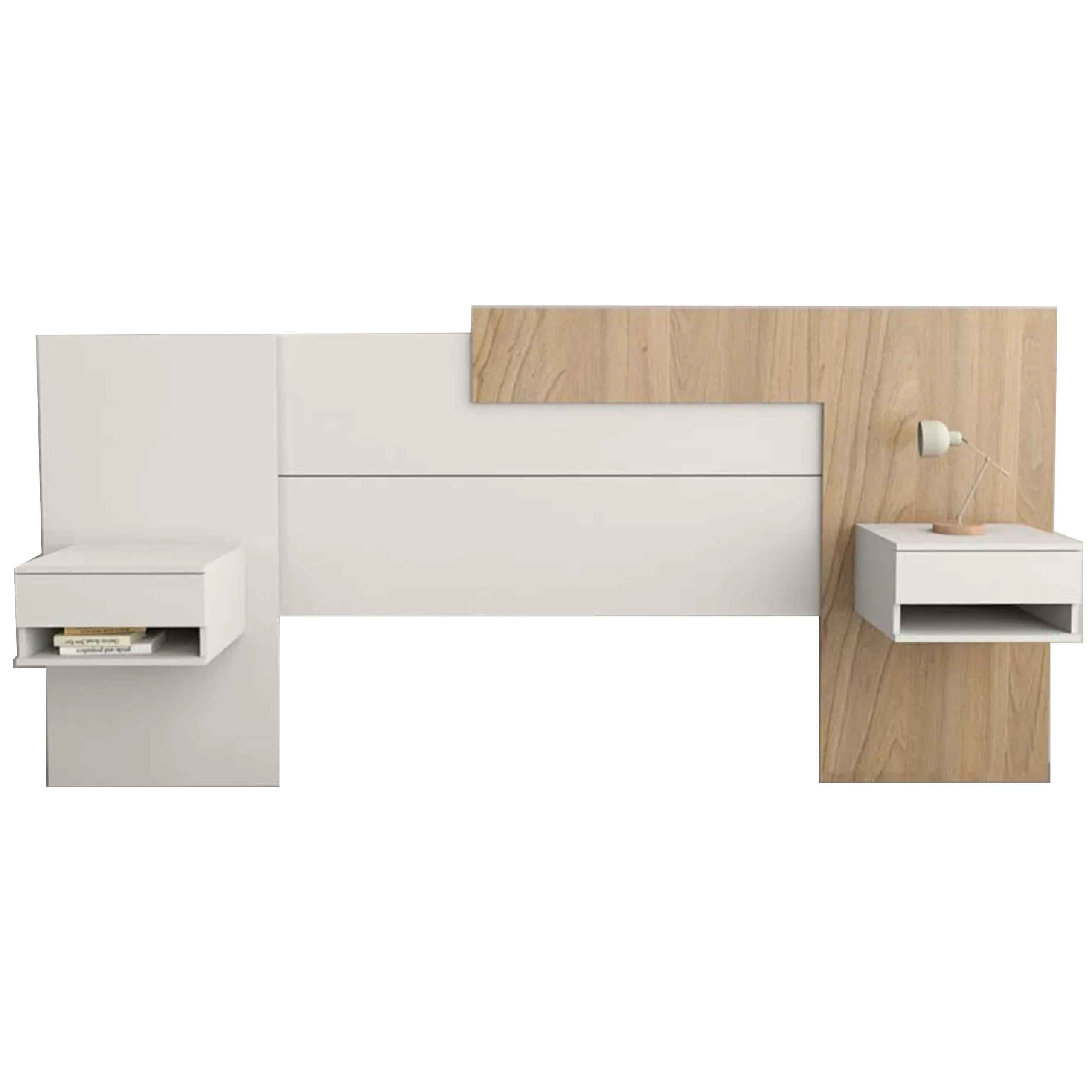 Fabricado en melamina color olmo finlandes combinado con everest / Para sommier de hasta 1.60 / Mesas de luz flotantes con 1 cajón / Medidas: 1.23 de alto x 0.39 de profundidad x 2.62-2.82 de largo.