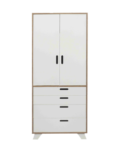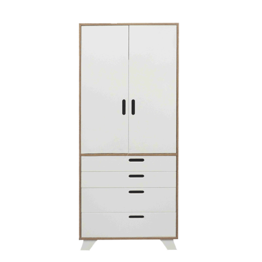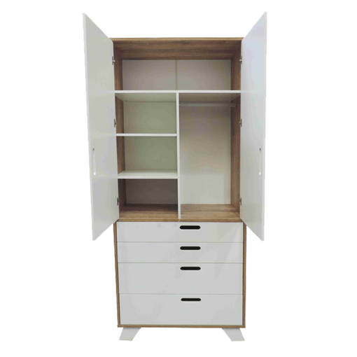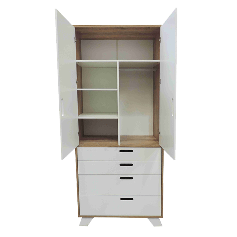 Fabricado en melamina texturada valiant en color atakama combinado con MDF laqueado semimate / 2 puertas de abrir con estantes y barral / 2 cajones chicos y 2 más profundos / Medida: Ancho 90 cm x alto 205 cm x profundidad 45 cm.