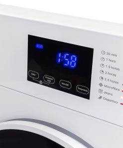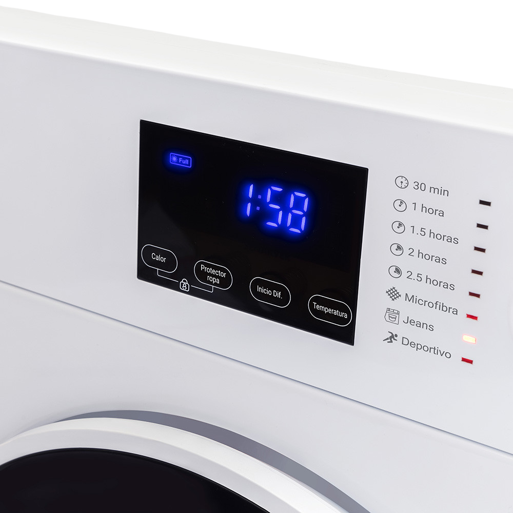 Secado por ventilación / Capacidad de secado 7Kg / 16 programas / Secado rápido 30min / Inicio diferido / Ropa delicada / Ciclo de aire frio / Medidas: 85cm de alto x 60cm de ancho x 53cm de profundidad / Blanco.