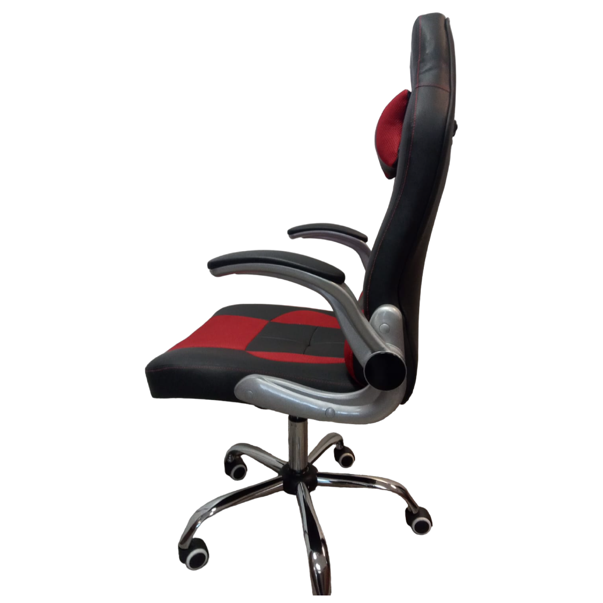 Respaldo y asiento en ecocuero negro combinado con rojo / Con almohada para la cabeza / Apoyabrazos rebatibles / Regulable / Basculante / Estrella cromada.