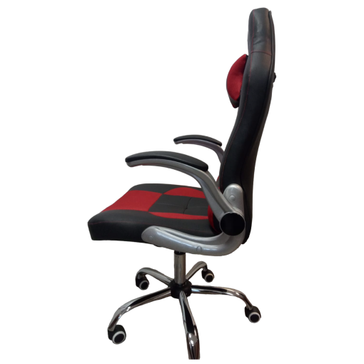 Respaldo y asiento en ecocuero negro combinado con rojo / Con almohada para la cabeza / Apoyabrazos rebatibles / Regulable / Basculante / Estrella cromada.