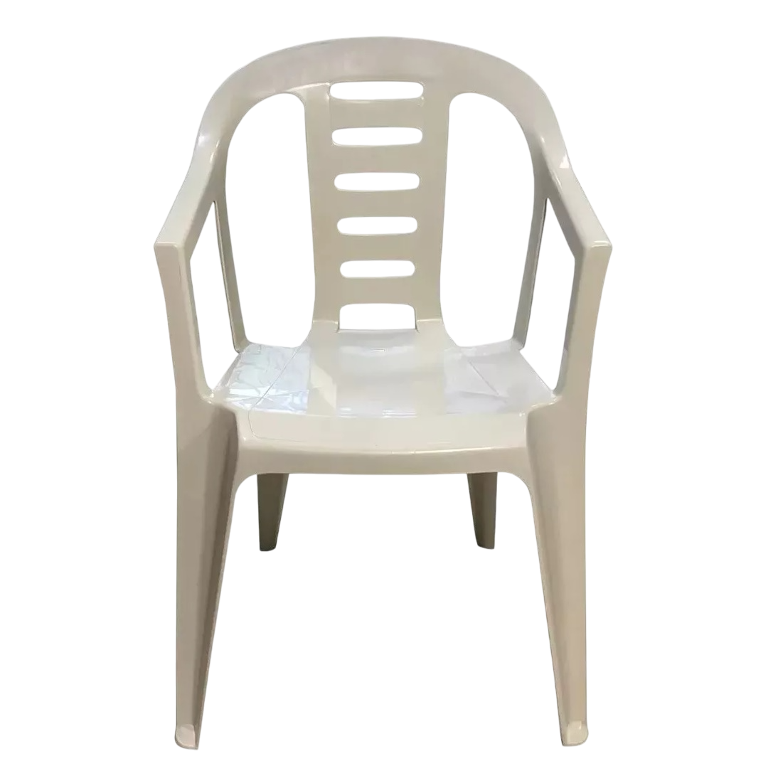 Silla apilable con brazos / Fabricada en polipropileno / Resiste 125Kg / Patas antideslizantes / Color blanca / Producto sin garantía.