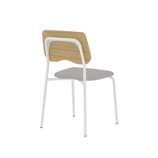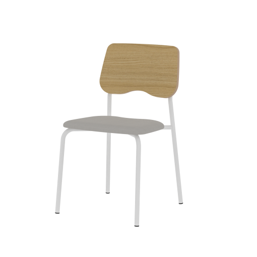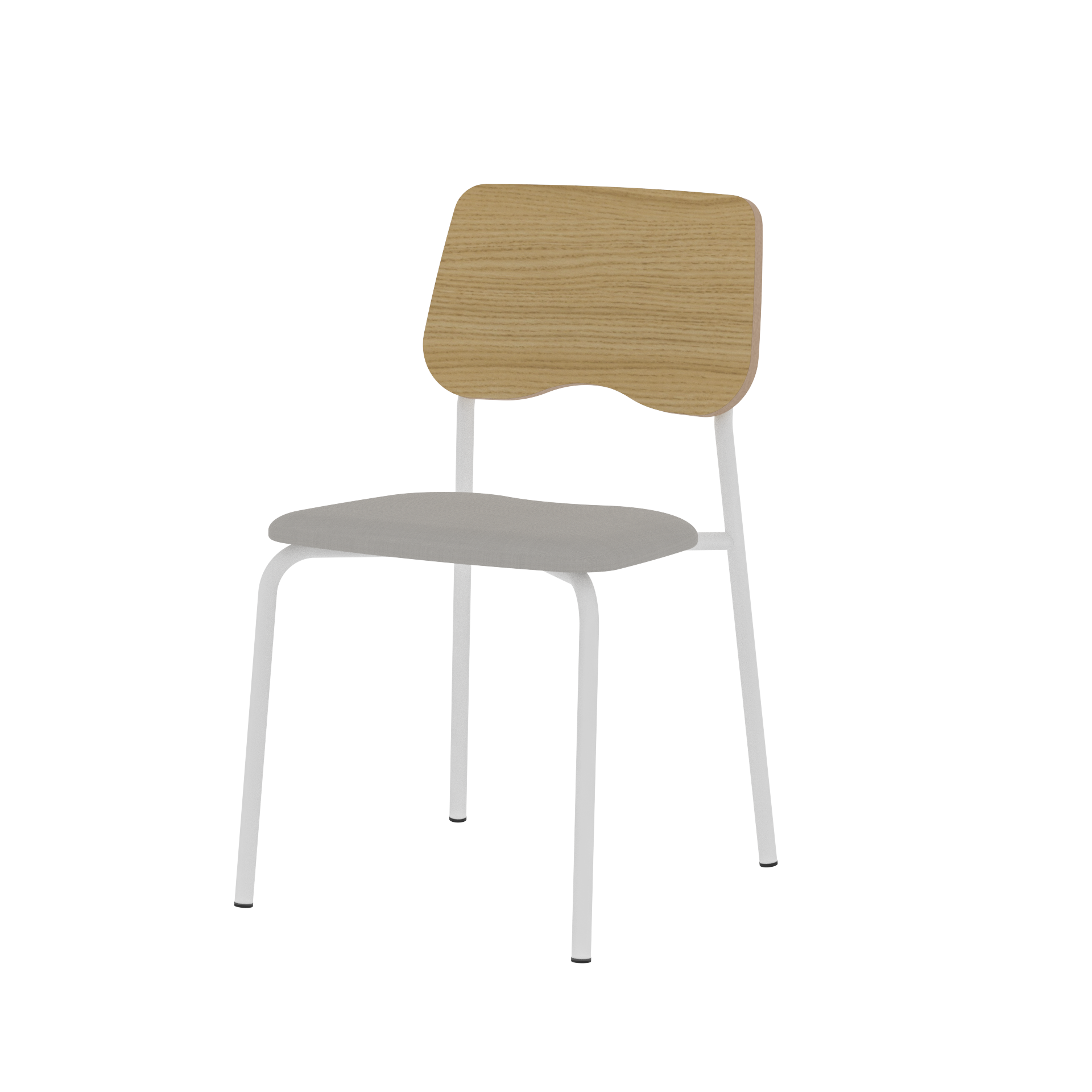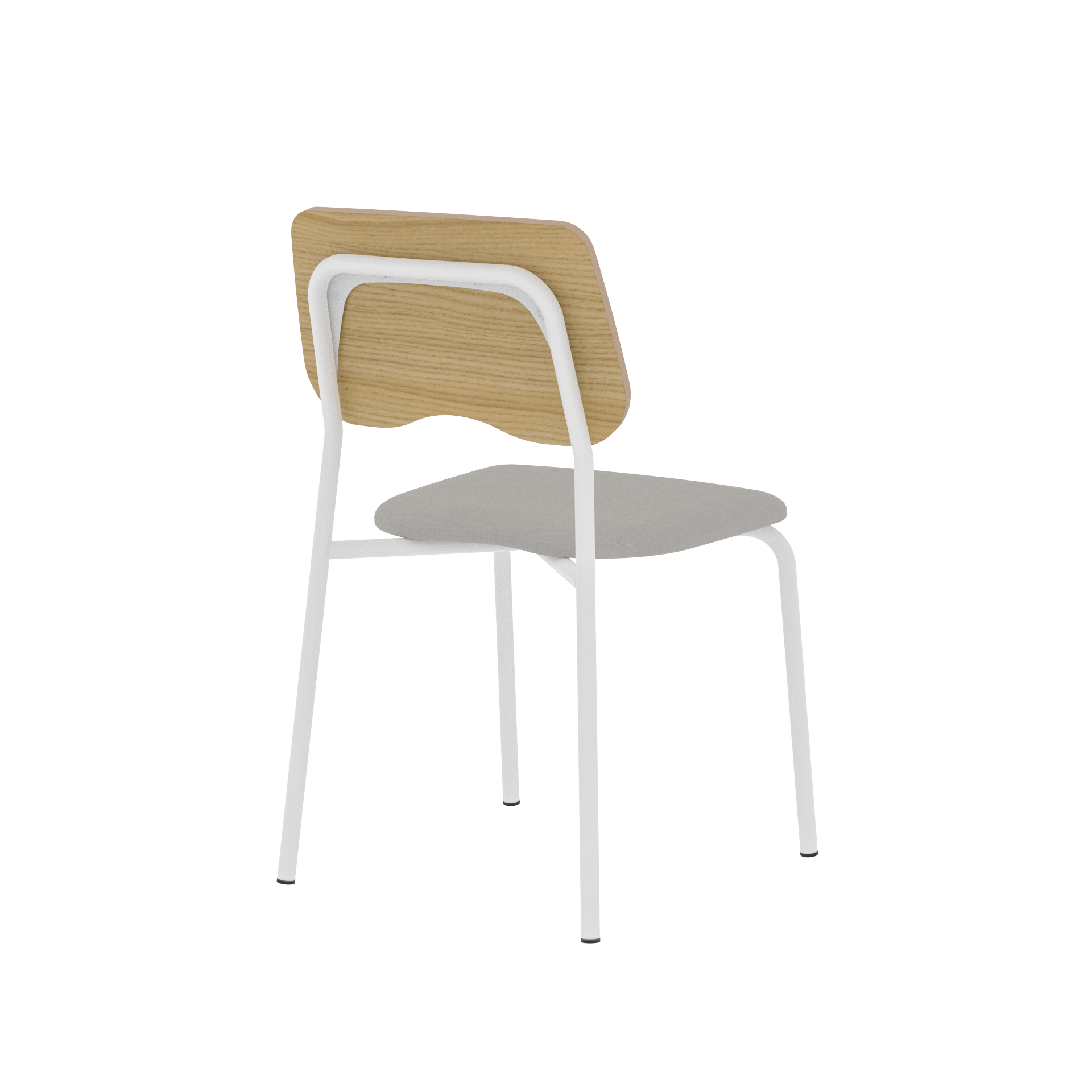 Estructura en caño rectangular color blanco / Asiento tapizado en tela chenille gris perla / Respaldo en MDF color roble.