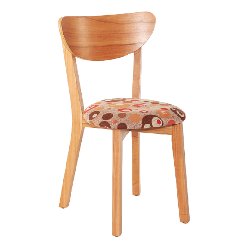 Fabricada en paraiso / Lustre natural / Asiento tapizado en tela grupo 2 / Respaldo curvo en madera.