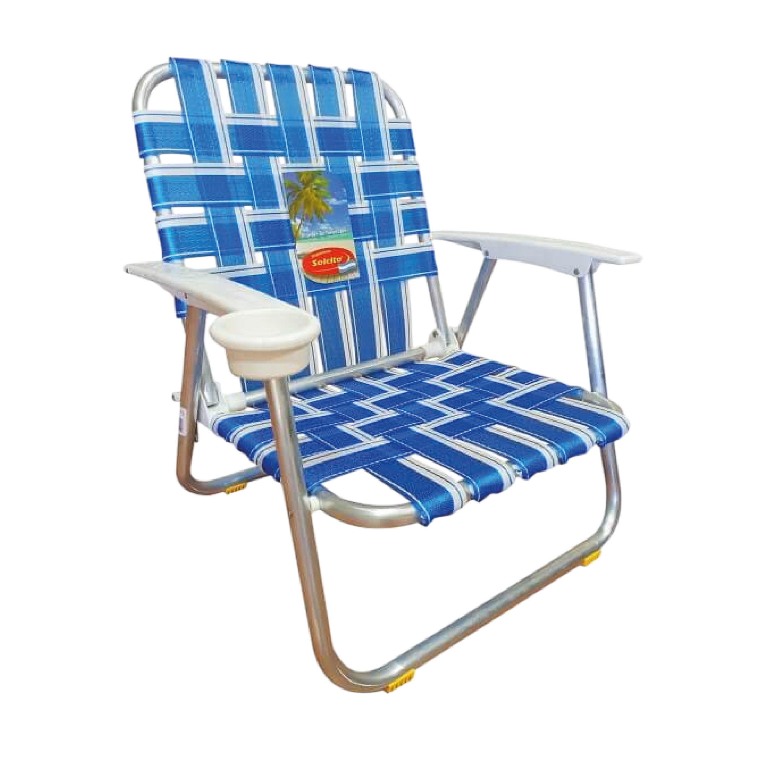 Sillón bajo / Cintas de polietileno tejidas / Tubos de aluminio 7/8 de diámetro / Apoyabrazos plásticos con porta vaso.