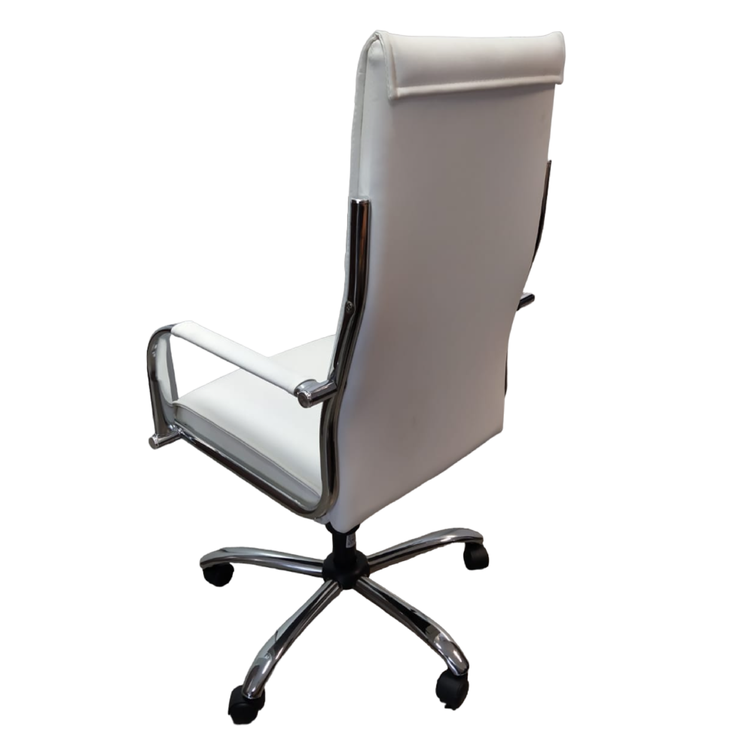 Respaldo alto / Estructura y estrella cromada / Basculante / Asiento y respaldo tapizado en eco cuero blanco.