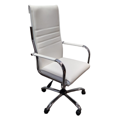 Respaldo alto / Estructura y estrella cromada / Basculante / Asiento y respaldo tapizado en eco cuero blanco.