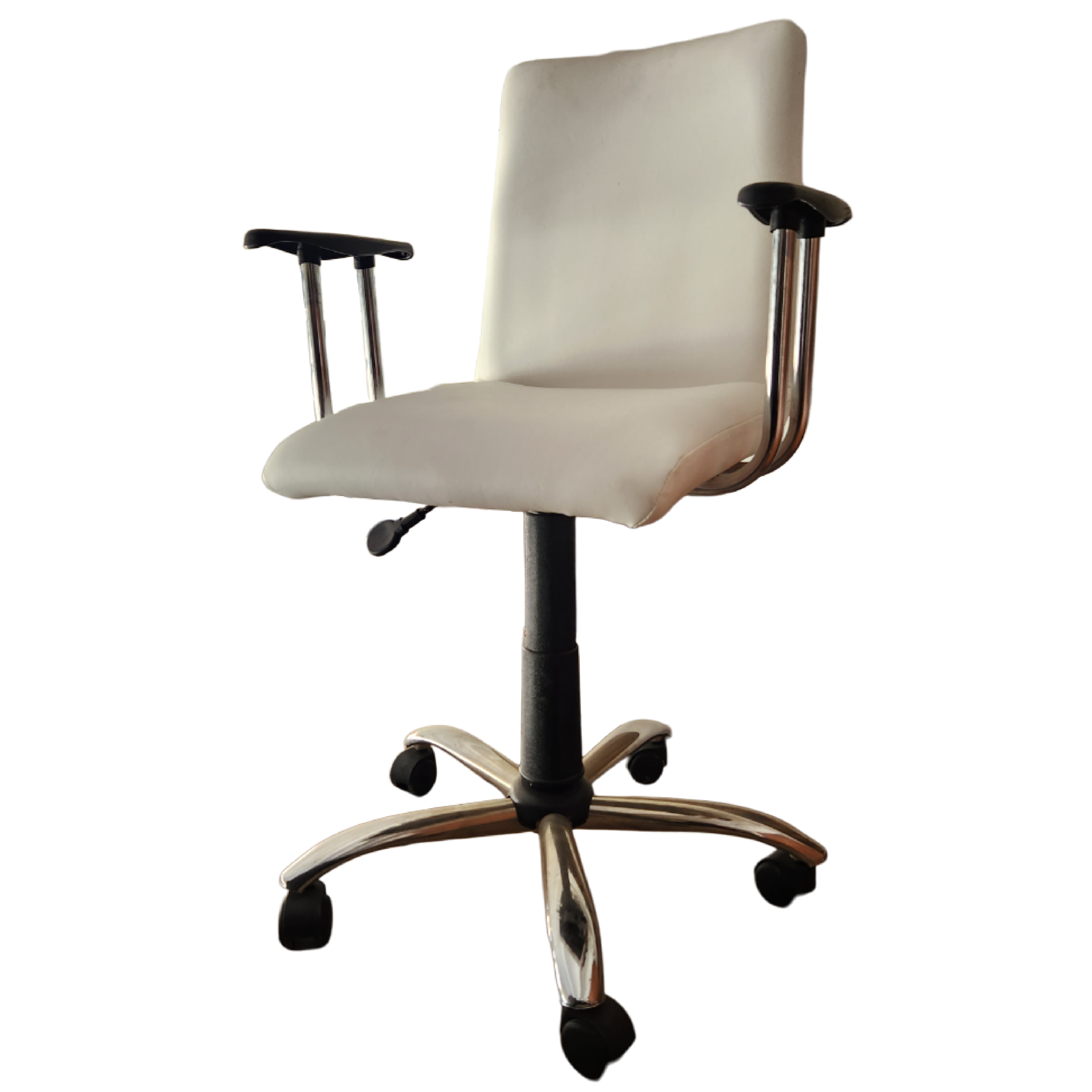 Estructura y estrella cromada / Giratorio / Regulación a gas / Con brazos / Asiento y respaldo tapizado en eco cuero blanco.