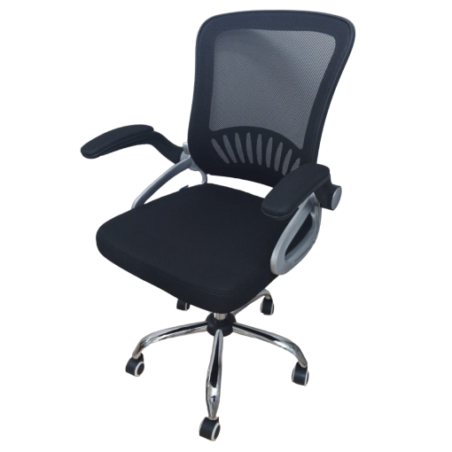 Respaldo ergonómico en tela mesh / Apoyabrazos rebatibles / Regulable / Estrella cromada / Negro.
