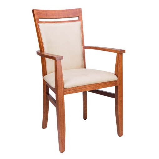 Silla con apoya brazo / fabricada en madera paraiso / Lustre cedro / Asiento y respaldo tapizado en tela grupo 2