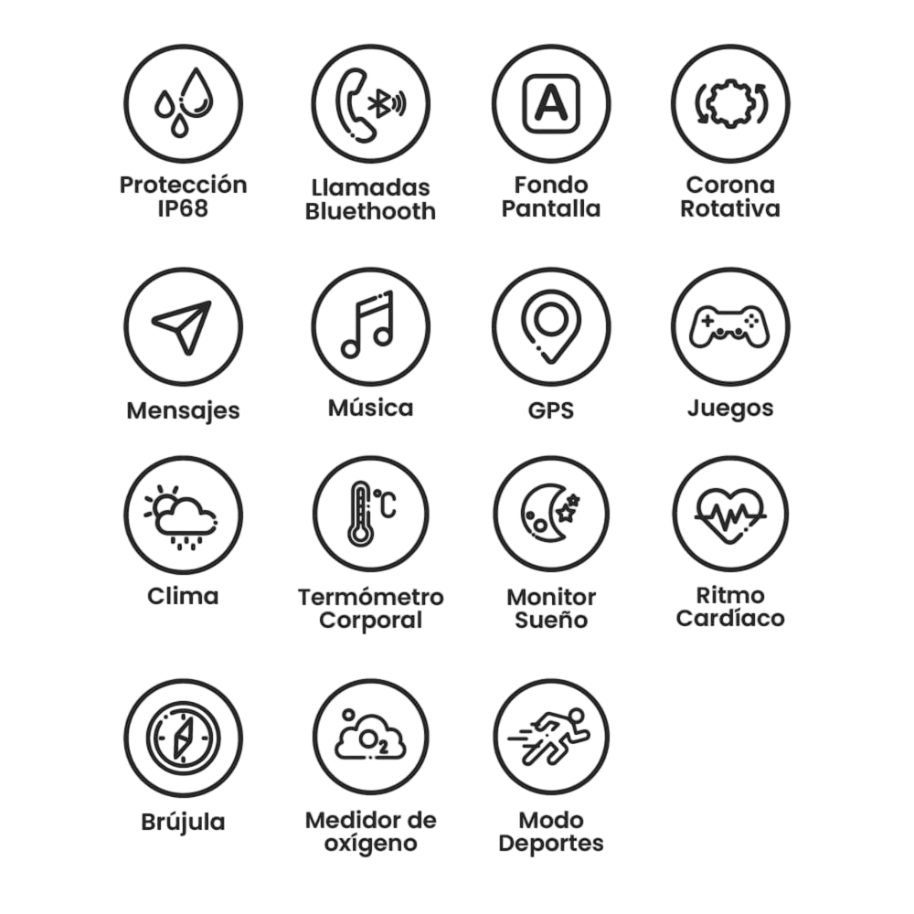 Pantalla Super Amoled 1.32 pulgadas / Carcaza de aluminio y malla de silicona / Protección IP68 contra agua y polvo / Batería 280mAh litio / Chat GPT / Control de voz / Mensajes / Brújula / Calculadora / GPS deportivo con registro de ruta / Llamadas bluetooth / Medidor de pulso, sueño y oxígeno en sangre / Modo deporte / Buscador de celular / Alarma / Cronómetro / Clima / Contactos / Control de música / Sacar foto / Sonido y vibración / Incluye cargador magnético inalámbrico / Black.
