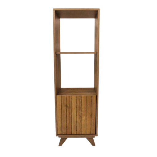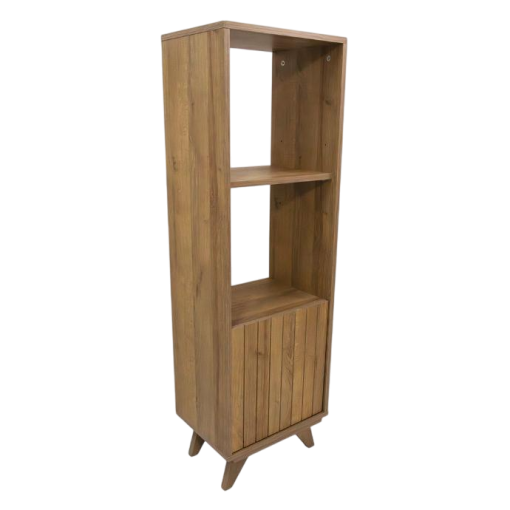 Torre biblioteca / Fabricado en melamina / 2 estantes y 1 puerta / Medidas: 1.26×0.39×0.30cm / Roble miel.
