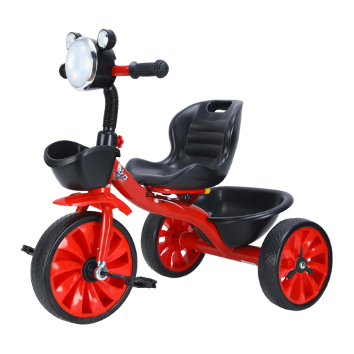 Triciclo tipo moto / Estructura de caño pintado / Con barral de empuje / Doble canasto / Apoyapies.