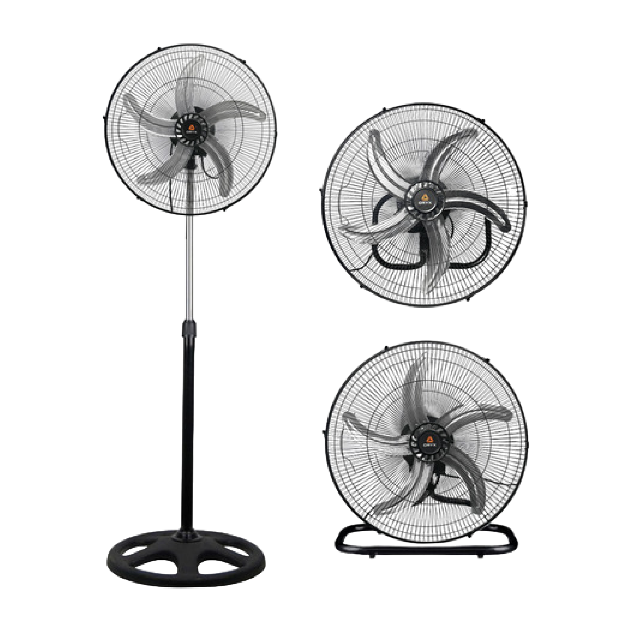 Ventilador 3en1: pie, pared y turbo / 18 pulgadas / 5 aspas de alumino / 100W / 3 velocidades / Cabezal oscilante y reclinable.