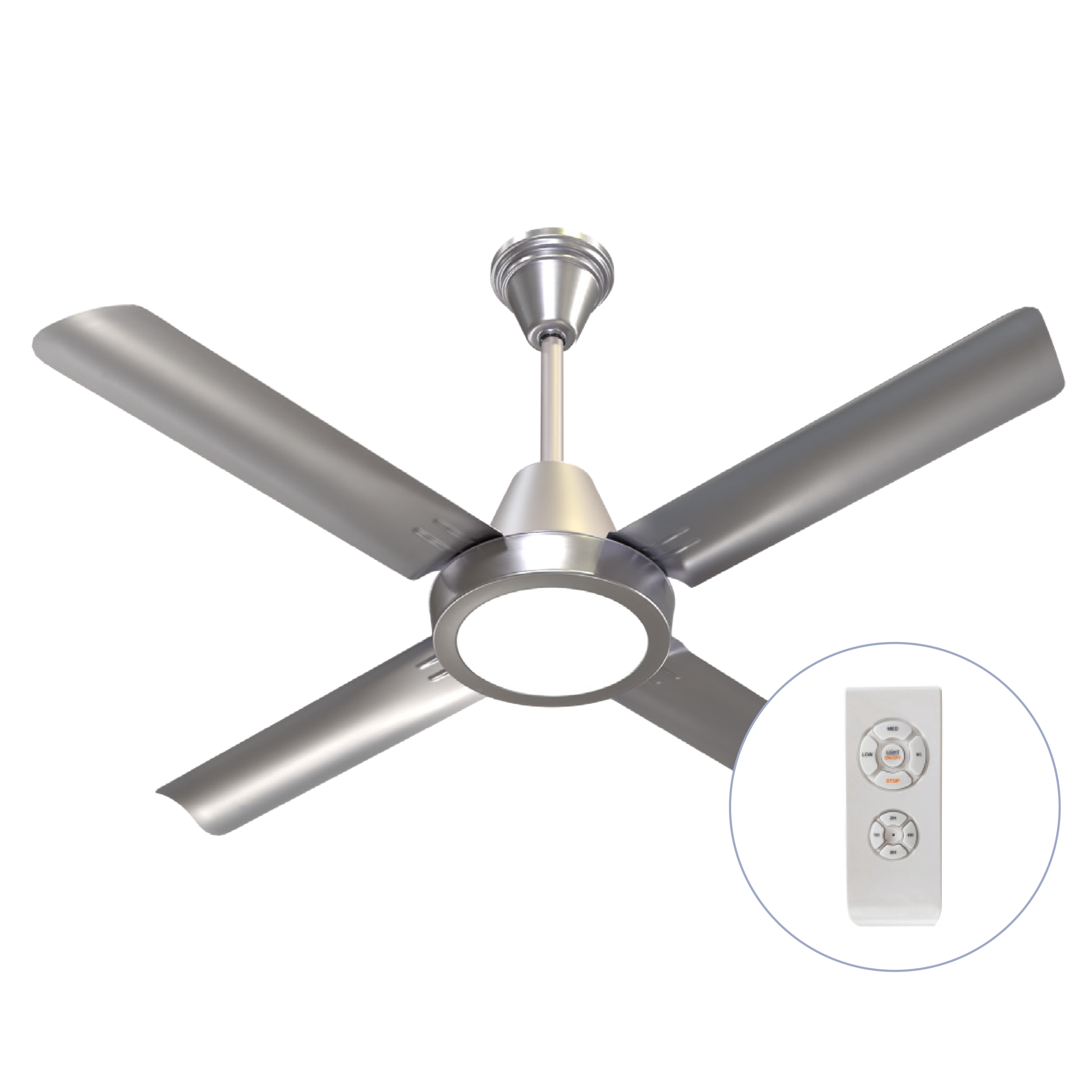 Ventilador de 4 palas de acero inoxidable / Motor AC de 85W, gran rendimiento y bajo consumo / Apto para exteriores / Montado sobre rodamientos blindados / Con plafón LED / 3 velocidades / Con control remoto.