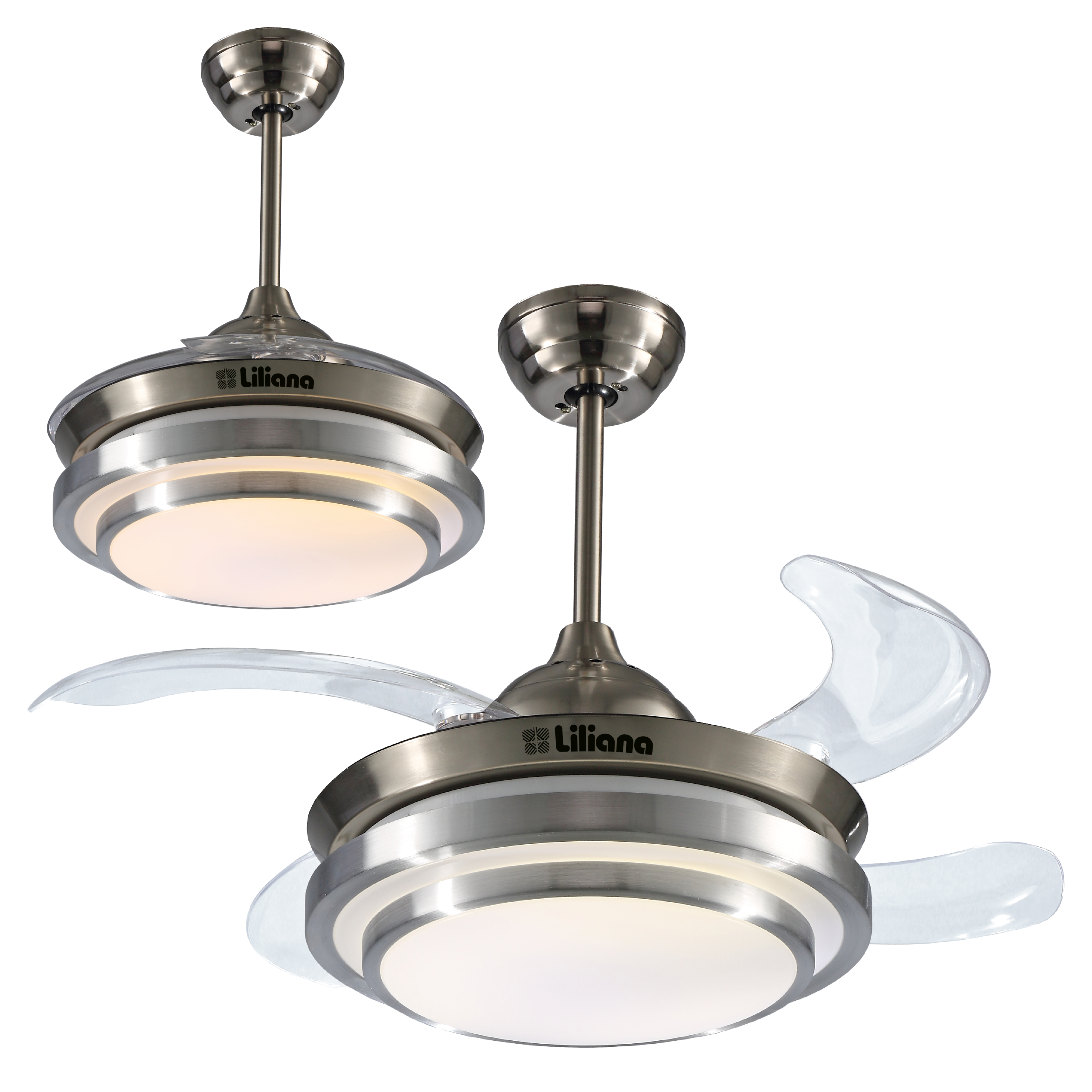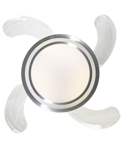 Ventilador de 4 palas retráctiles transparentes / Motor silencioso / 80W – 285rpm / 6 velocidades / Luz LED de 3 intensidades: Fría, Blanca Cálida y Amarilla Cálida / Timer / Control remoto / Bajo consumo.