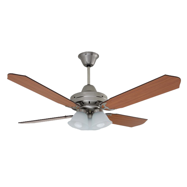 4 palas de madera / Araña con 3 luces / Regulador de 5 velocidades 60/340 RPM / Interruptor para iluminación / 120 cm de diametro / Color: Platil.